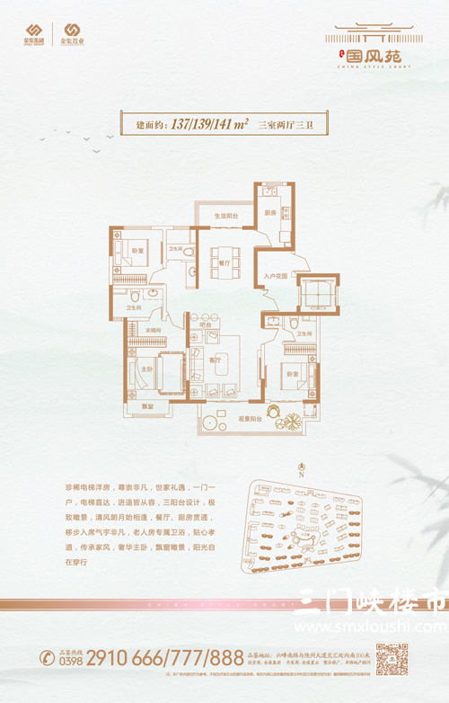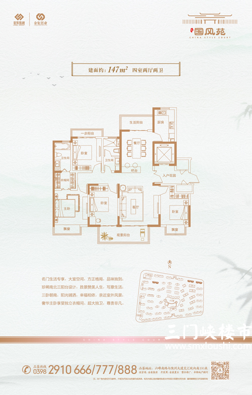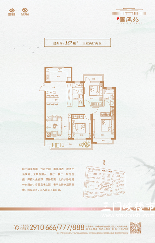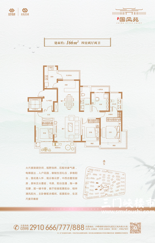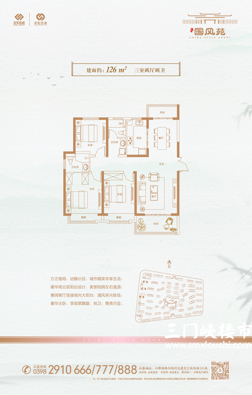 一、项目简介:金渠·国风苑改善型住宅项目位于三门峡市涧河南岸黄金地段,西临六峰南路、北依陕州大道,居于驳接新老城区的中心位置,是金渠集团为满足峡市各界精英对改善型住房的市场化需求而精心打造的系列高品质楼盘。位置优越,便利生活:小区依山傍水,品质天成。小区西部规划有高端幼托和中心小学,东部规划有重点中学,可放心让孩子在您视线之内接受最优质的基础教育。  二、规模:总占地面积265亩,总建筑面积约50万㎡,地上面积约31万㎡,容积率1.86,绿化率40%。  三、风格:新中式建筑,中式庭院儒雅国风(起于门庭,归家礼制;承于形制,多维胜景;转于亭间,七大园林;合于玉湖,同醉国风)规划特色:中式园林、7000㎡翡翠玉湖、智能化社区、人车分流  四、智能高科:精选近20种高新科技,新雾森系统、除雾霾新风系统、智能家居系统、深度净化理想水系统、建筑保温一体化