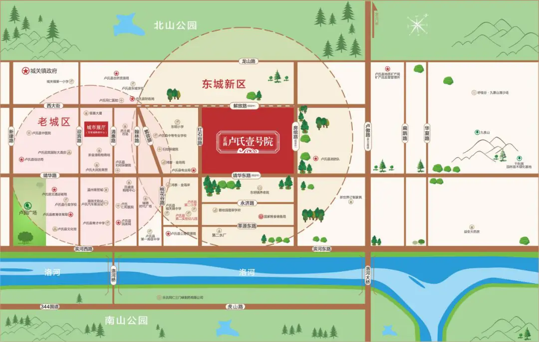 商业:煊德时代购物广场,医院:卢氏县妇幼保健院(新院区),教育:卢氏县一高,城关镇中学,卢氏县二小,卢氏县第二实验幼儿园。