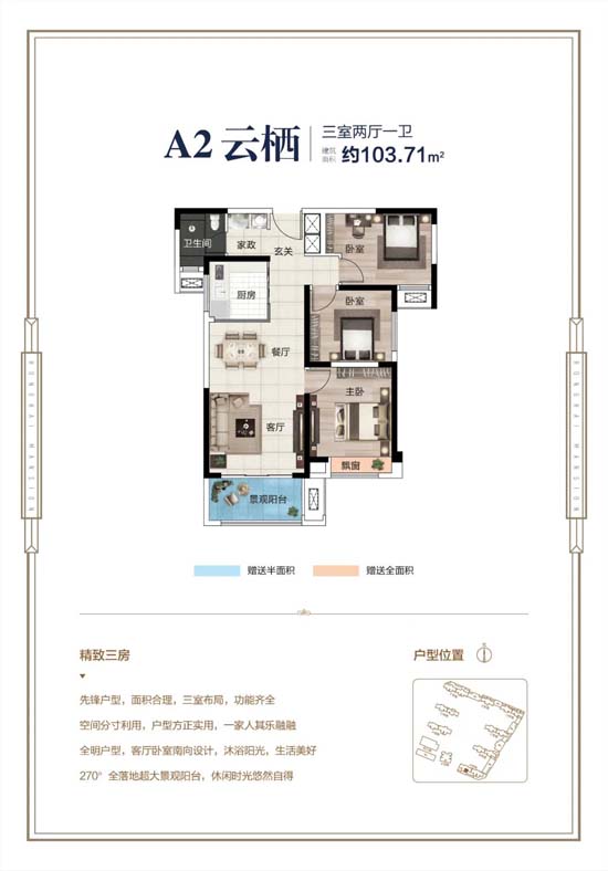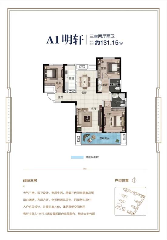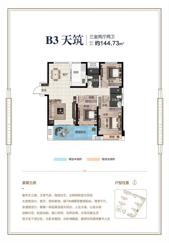 AB栋建面约103-144㎡IMAX级宽境新品,打造大尺度的宽居生活体验,约7米双开间观景大阳台,约13米大面宽采光,阔绰客厅、双卧朝南,极佳的采光通风性能让生活美好每一天。