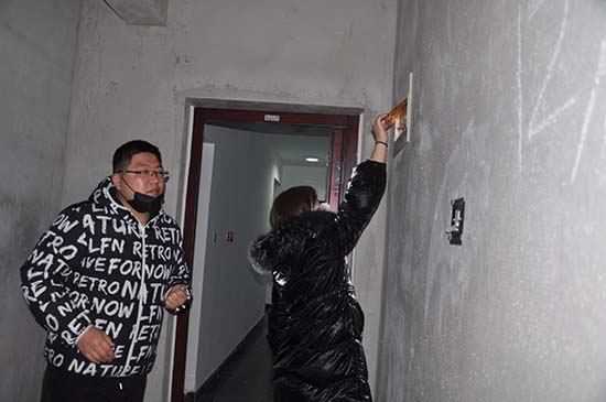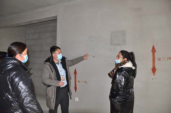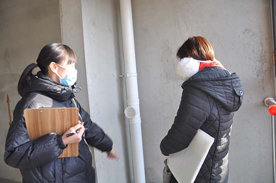 业主在工程人员的陪同下,来到自己的新家中,查看门窗、墙壁、防水等,陪同人员对业主提出的问题耐心解答。