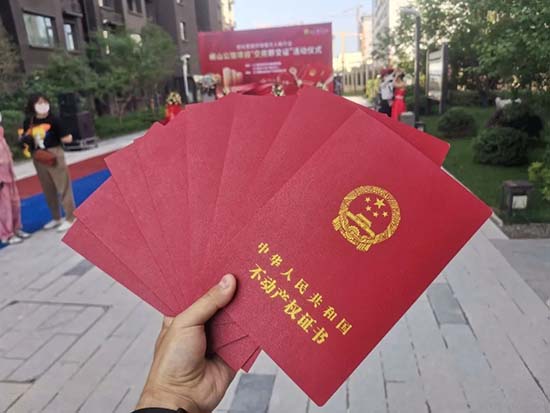 当日上午,6名业主代表满脸笑容,一手拿着钥匙,一手拿着不动产权证书,顺利完成了交房手续。
